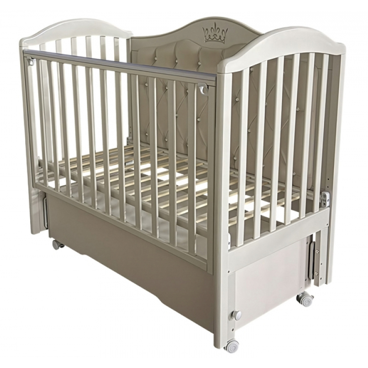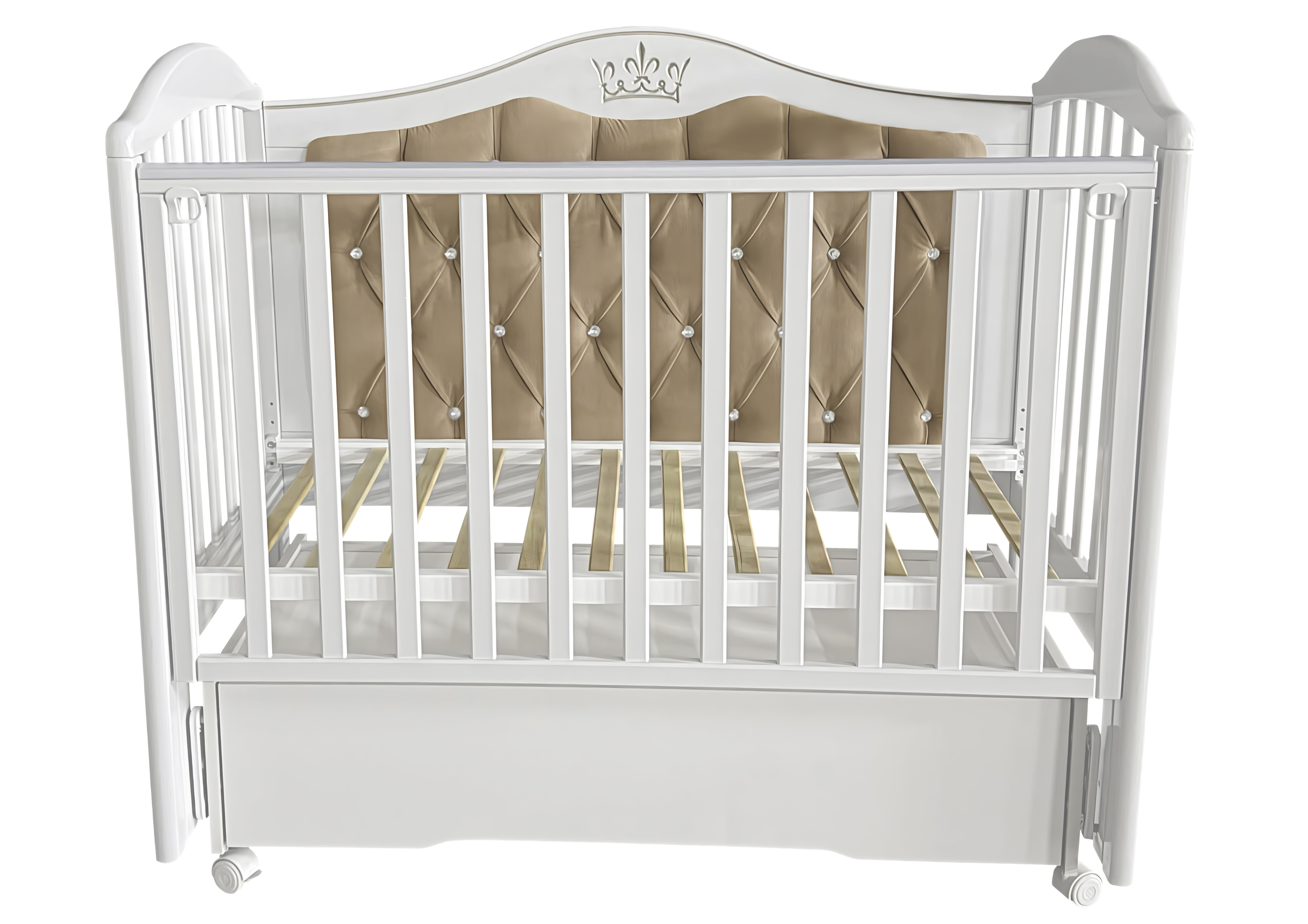 Кроватка EMILY 4 с мягким задним ограждением, с велюровой отделкой и стразами сочетает в себе классический дизайн, комфорт и широкий набор функций. Верхняя часть заднего ограждения и фасад ящика имеют оформление в виде декоративной резьбы. Модель оснащена подвижными передним ограждением с удобным механизмом фиксации в двух положениях по высоте. В комплекте с кроватью есть универсальный маятниковый механизм, что позволяет собрать кровать либо с поперечным маятником, либо с продольным, в зависимости от того, какой тип укачивания Вам необходим. Удобный вместительный ящик на шариковых направляющих позволяет хранить в нем вещи не опасаясь за то, что внутрь попадет пыль. Кровать выполнена из экологически чистых материалов, которые абсолютно безопасны для ребенка.
