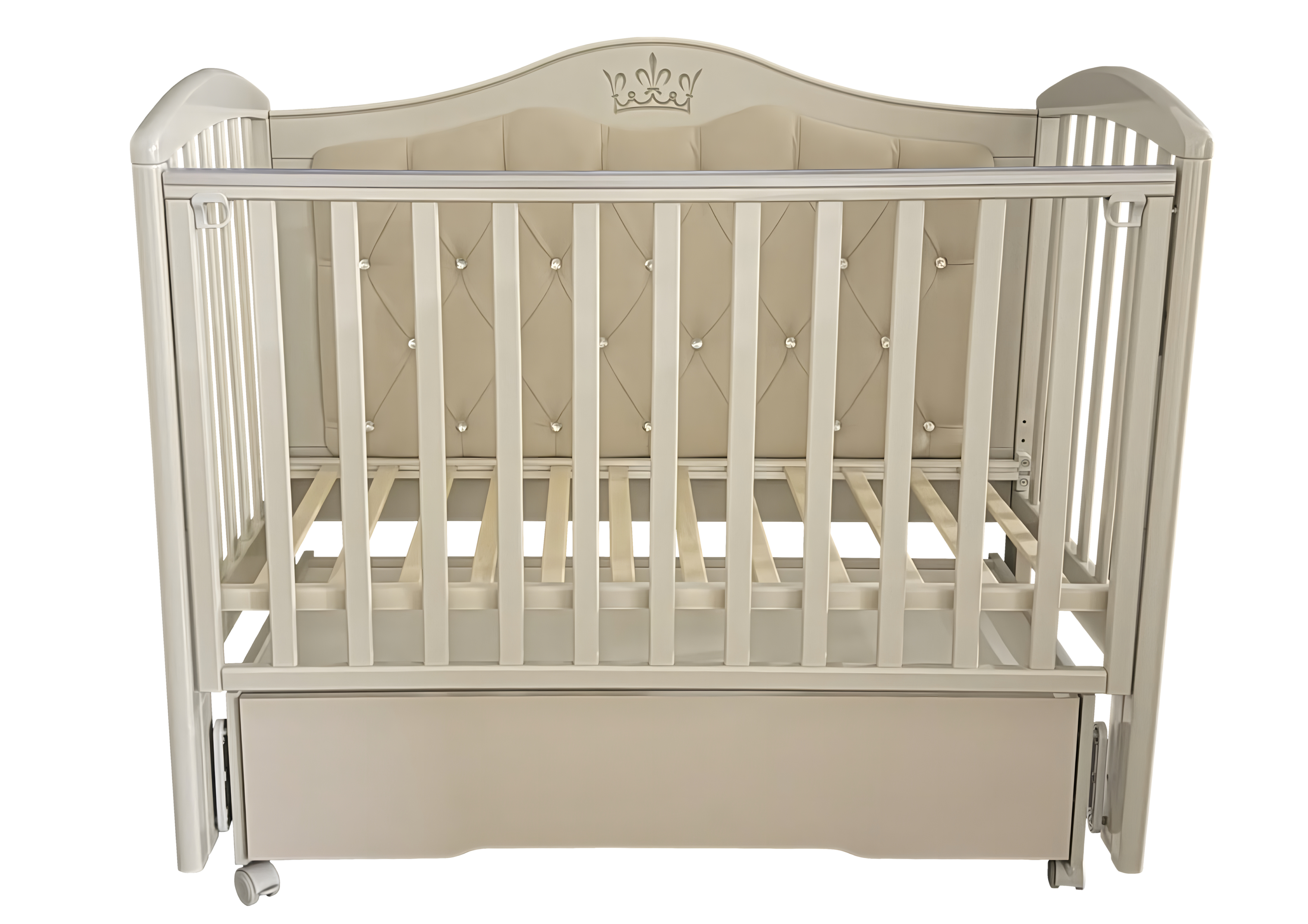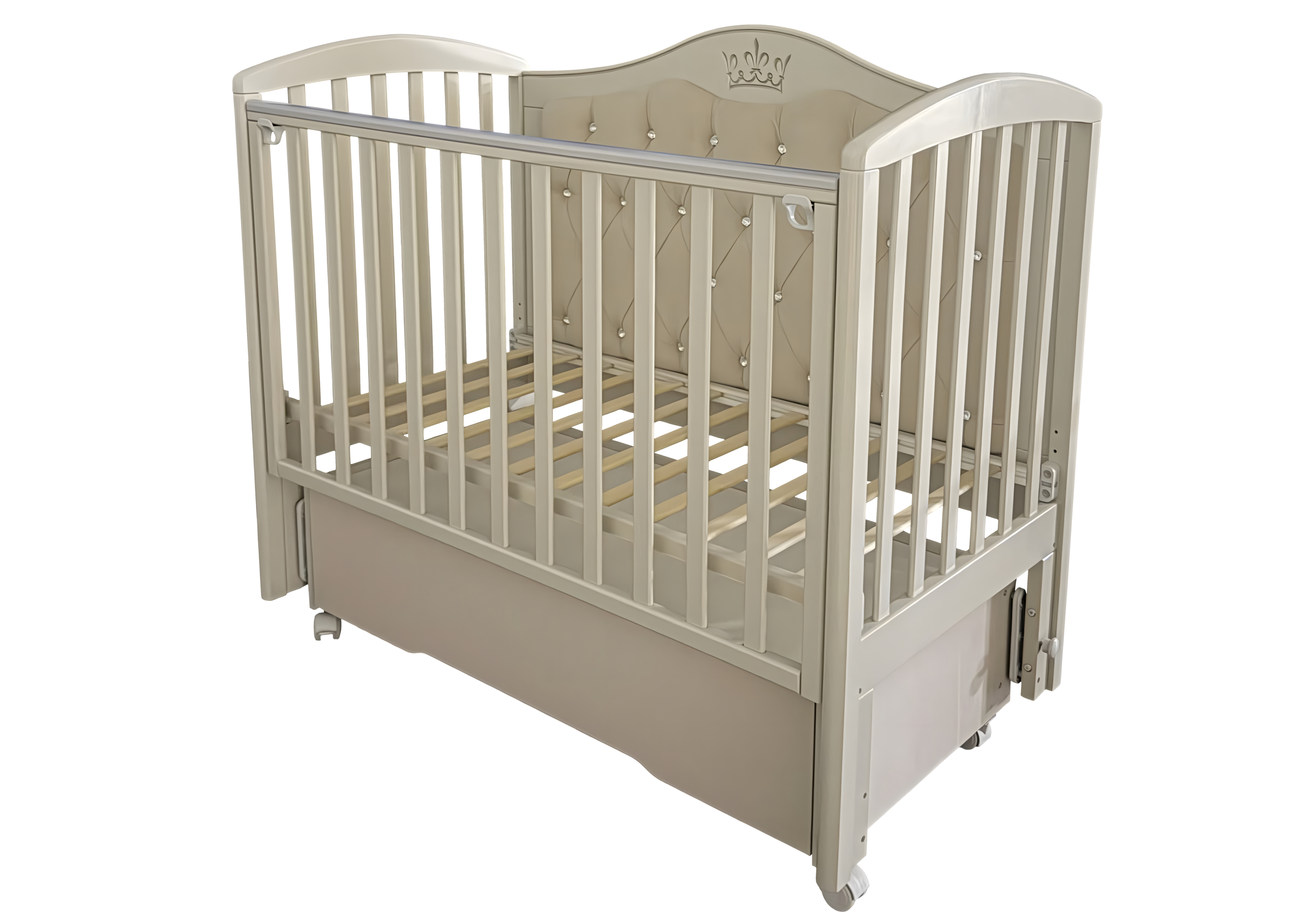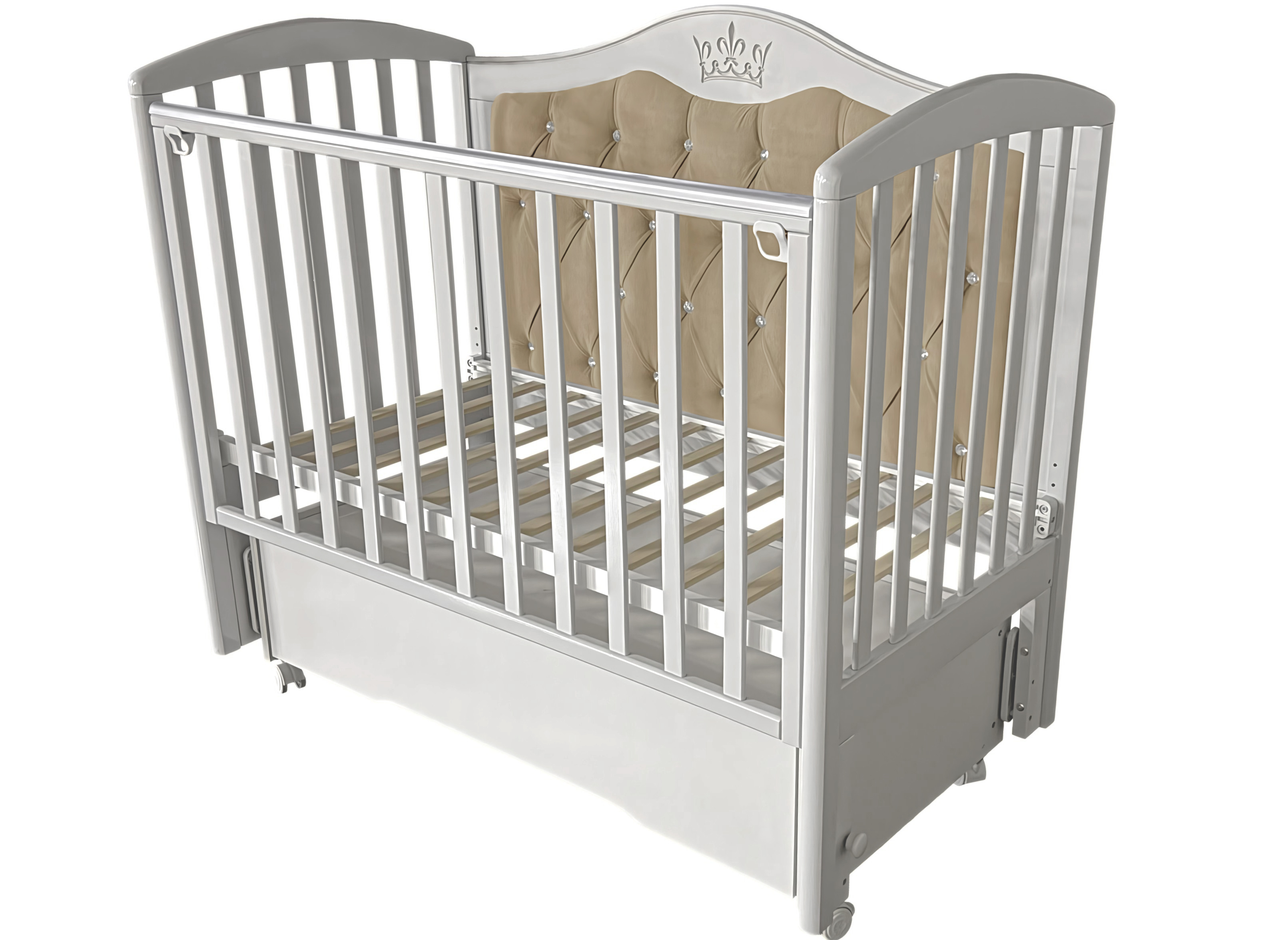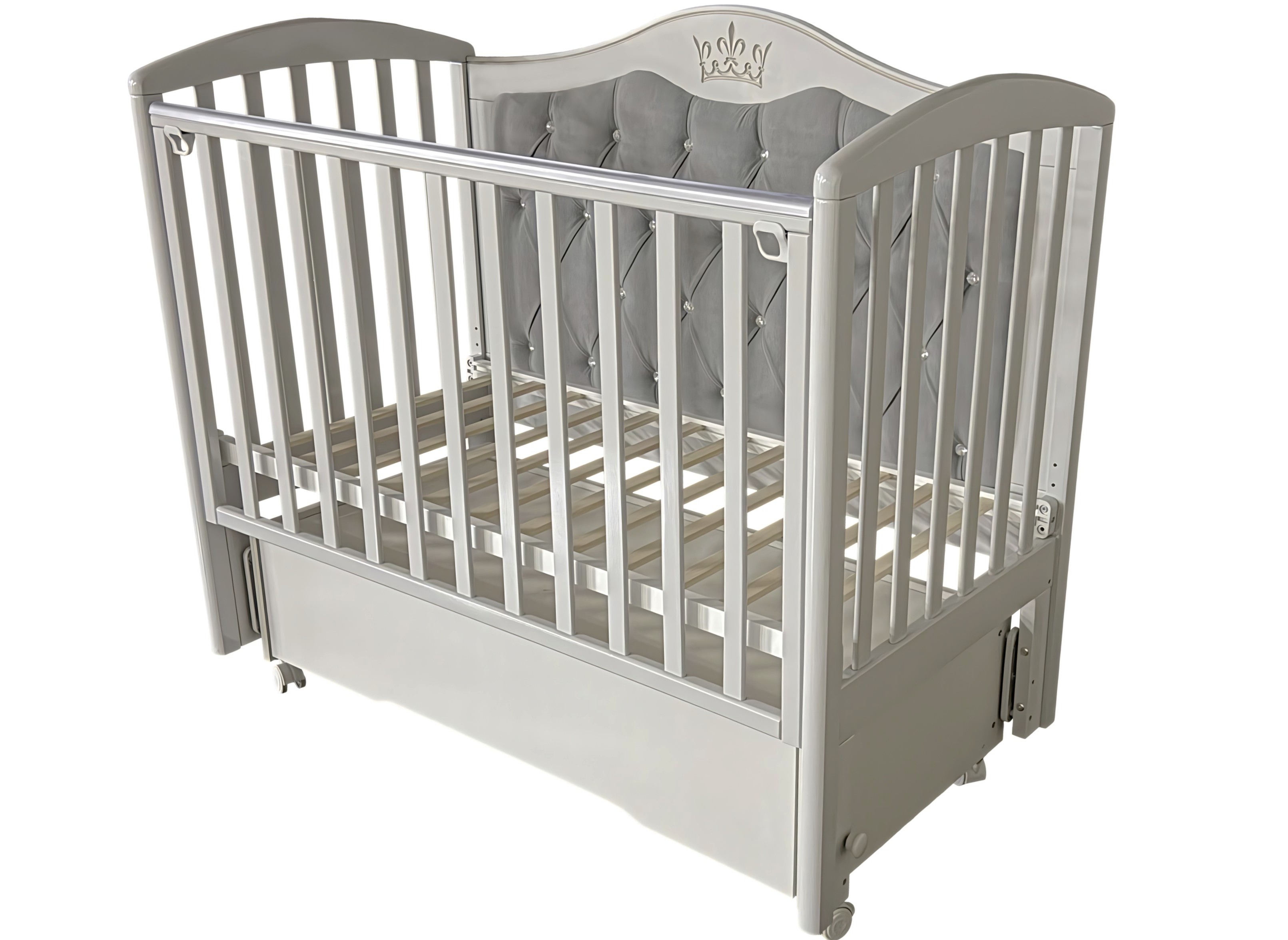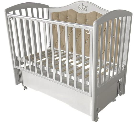 Кроватка Helen 7 с мягким задним ограждением, с велюровой отделкой и украшенным стразами сочетает в себе классический дизайн, комфорт и широкий набор функций. Верхняя часть заднего ограждения и фасад ящика имеют оформление в виде декоративной резьбы. Модель оснащена подвижными передним ограждением с удобным механизмом фиксации в двух положениях по высоте. В комплекте с кроватью есть универсальный маятниковый механизм, что позволяет собрать кровать либо с поперечным маятником, либо с продольным, в зависимости от того, какой тип укачивания Вам необходим. Удобный вместительный ящик на шариковых направляющих позволяет хранить в нем вещи не опасаясь за то, что внутрь попадет пыль. Кровать выполнена из экологически чистых материалов, которые абсолютно безопасны для ребенка.