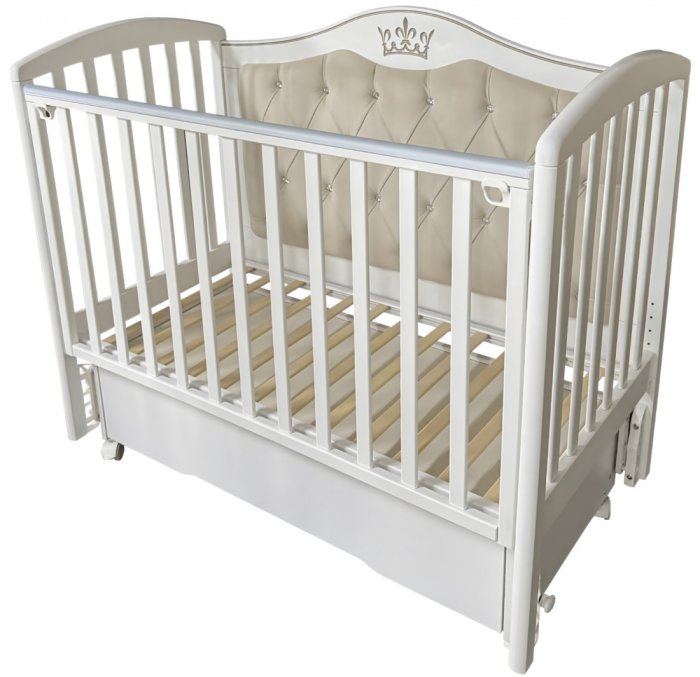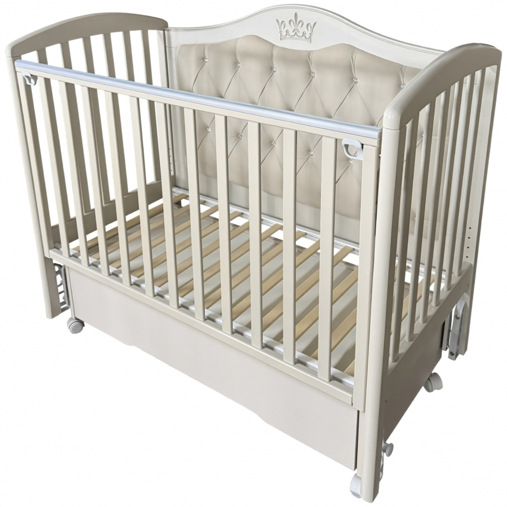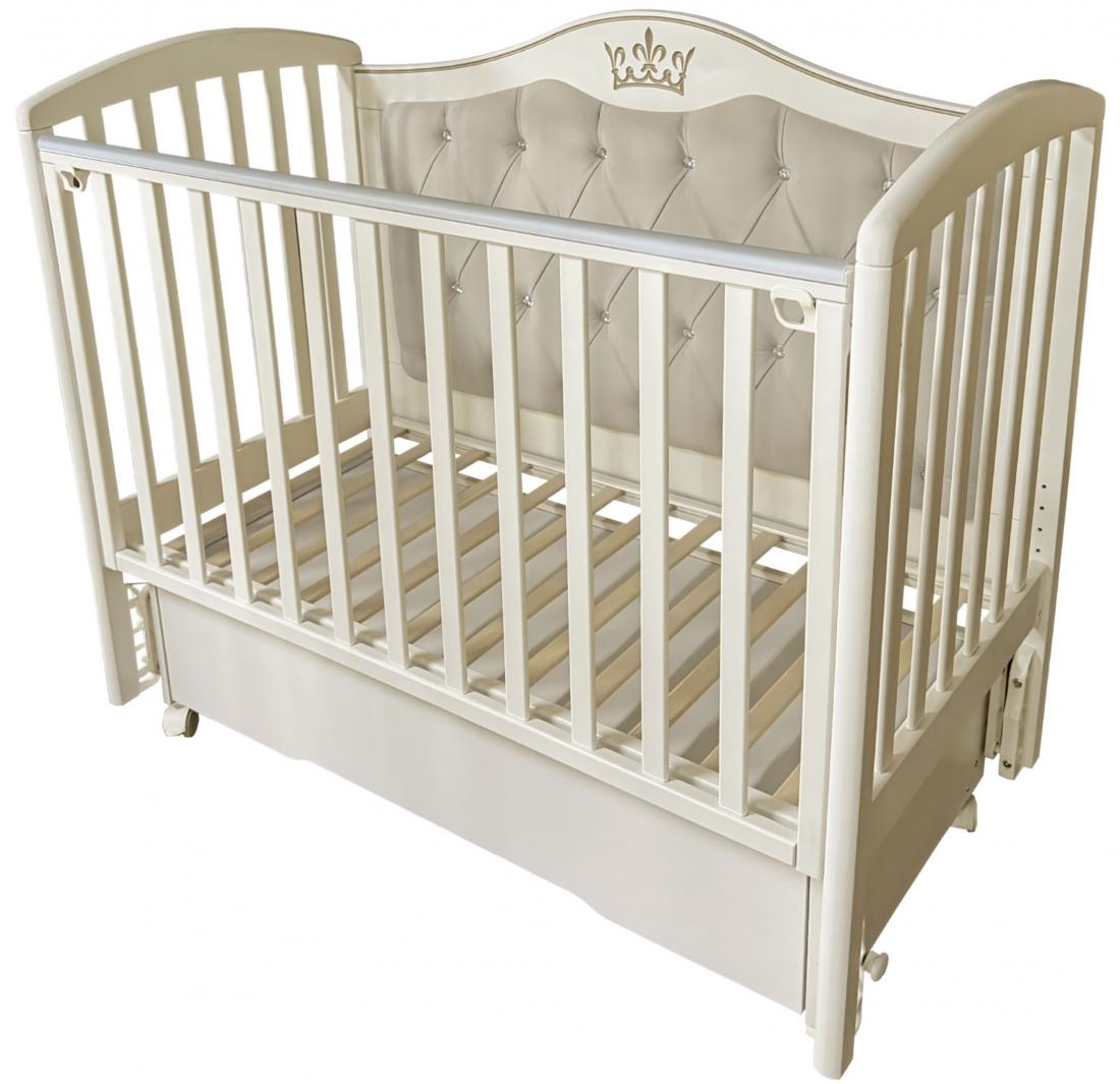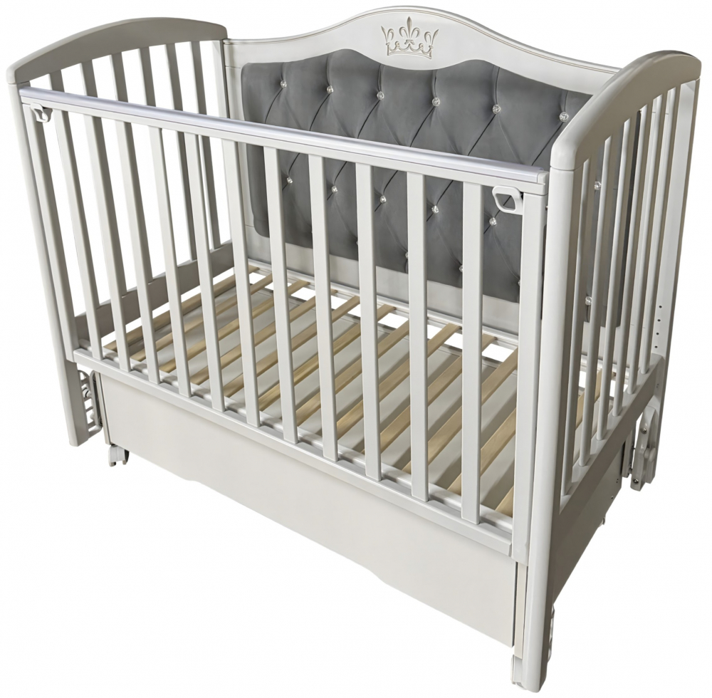 Кроватка ЛЮСИ 4 с мягким задним ограждением, с велюровой отделкой и украшенным стразами сочетает в себе классический дизайн, комфорт и широкий набор функций. Верхняя часть заднего ограждения и фасад ящика имеют оформление в виде декоративной резьбы. Модель оснащена подвижными передним ограждением с удобным механизмом фиксации в двух положениях по высоте. В комплекте с кроватью есть универсальный маятниковый механизм, что позволяет собрать кровать либо с поперечным маятником, либо с продольным, в зависимости от того, какой тип укачивания Вам необходим. Удобный вместительный ящик на шариковых направляющих позволяет хранить в нем вещи не опасаясь за то, что внутрь попадет пыль. Кровать выполнена из экологически чистых материалов, которые абсолютно безопасны для ребенка.