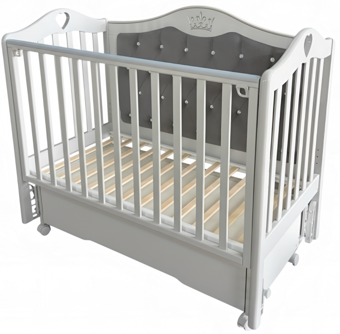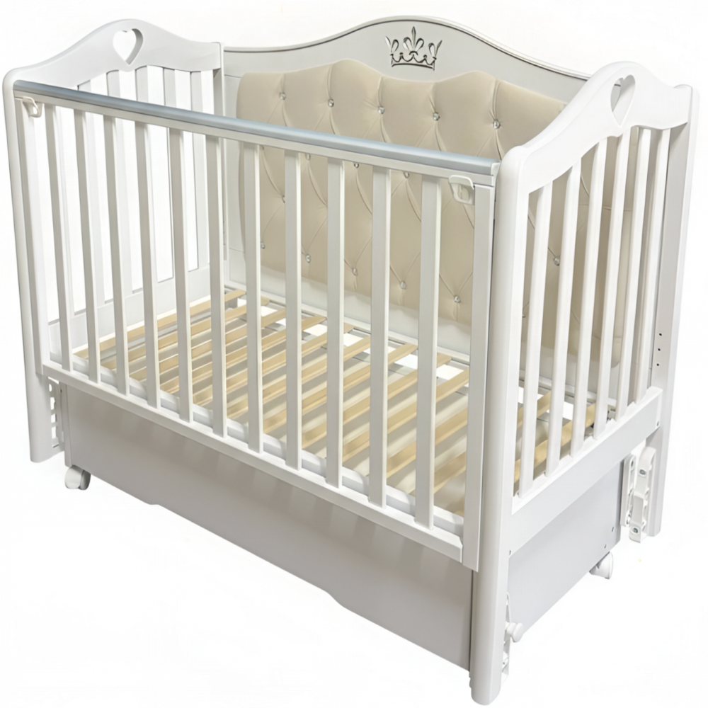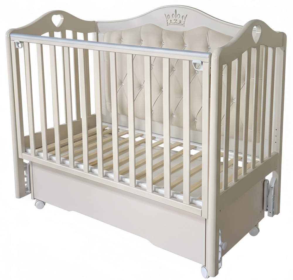 Кроватка ДАРИНА 4 с мягким задним ограждением, с велюровой отделкой и украшенным стразами сочетает в себе классический дизайн, комфорт и широкий набор функций. Верхняя часть заднего ограждения имеет оформление в виде декоративной резьбы. Модель оснащена подвижными передним ограждением с удобным механизмом фиксации в двух положениях по высоте. В комплекте с кроватью есть универсальный маятниковый механизм, что позволяет собрать кровать либо с поперечным маятником, либо с продольным, в зависимости от того, какой тип укачивания Вам необходим. Удобный вместительный ящик на шариковых направляющих позволяет хранить в нем вещи не опасаясь за то, что внутрь попадет пыль. Также в комплекте есть колеса, позволяющие передвигать кровать по комнате. Кровать выполнена из экологически чистых материалов, которые абсолютно безопасны для ребенка.
