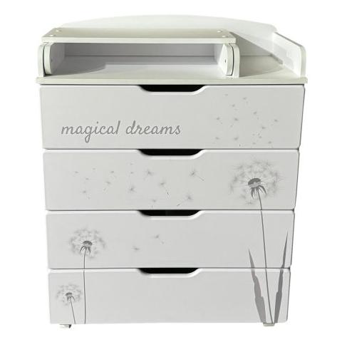 Пеленальный комод ALINA - практичный и незаменимый предмет мебели в детской комнате. Комод имеет 4 выдвижных ящика на шариковых направляющих, колесики для удобства перемещения, откидной пеленальный столик для проведения всех необходимых гигиенических процедур с малышом.