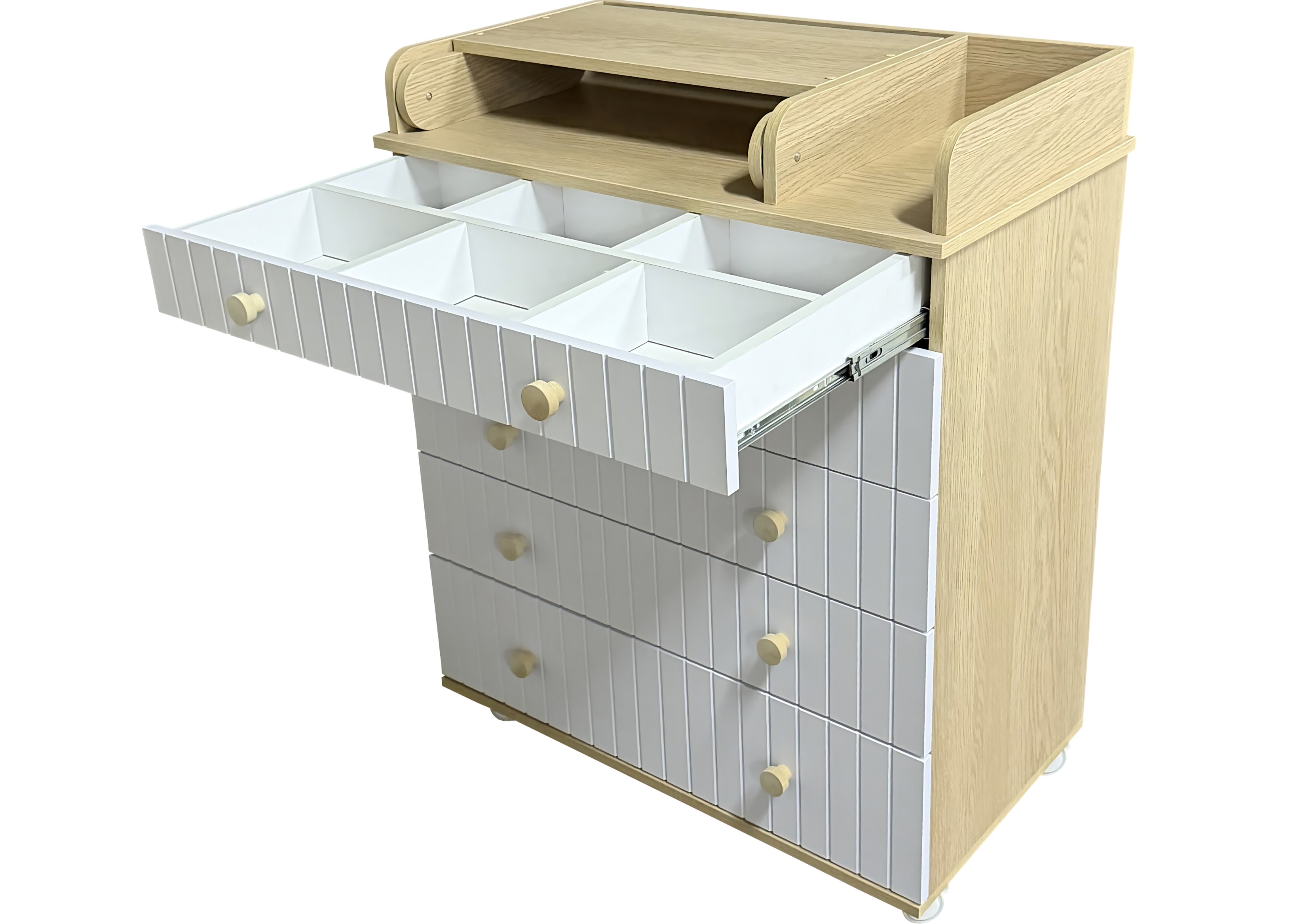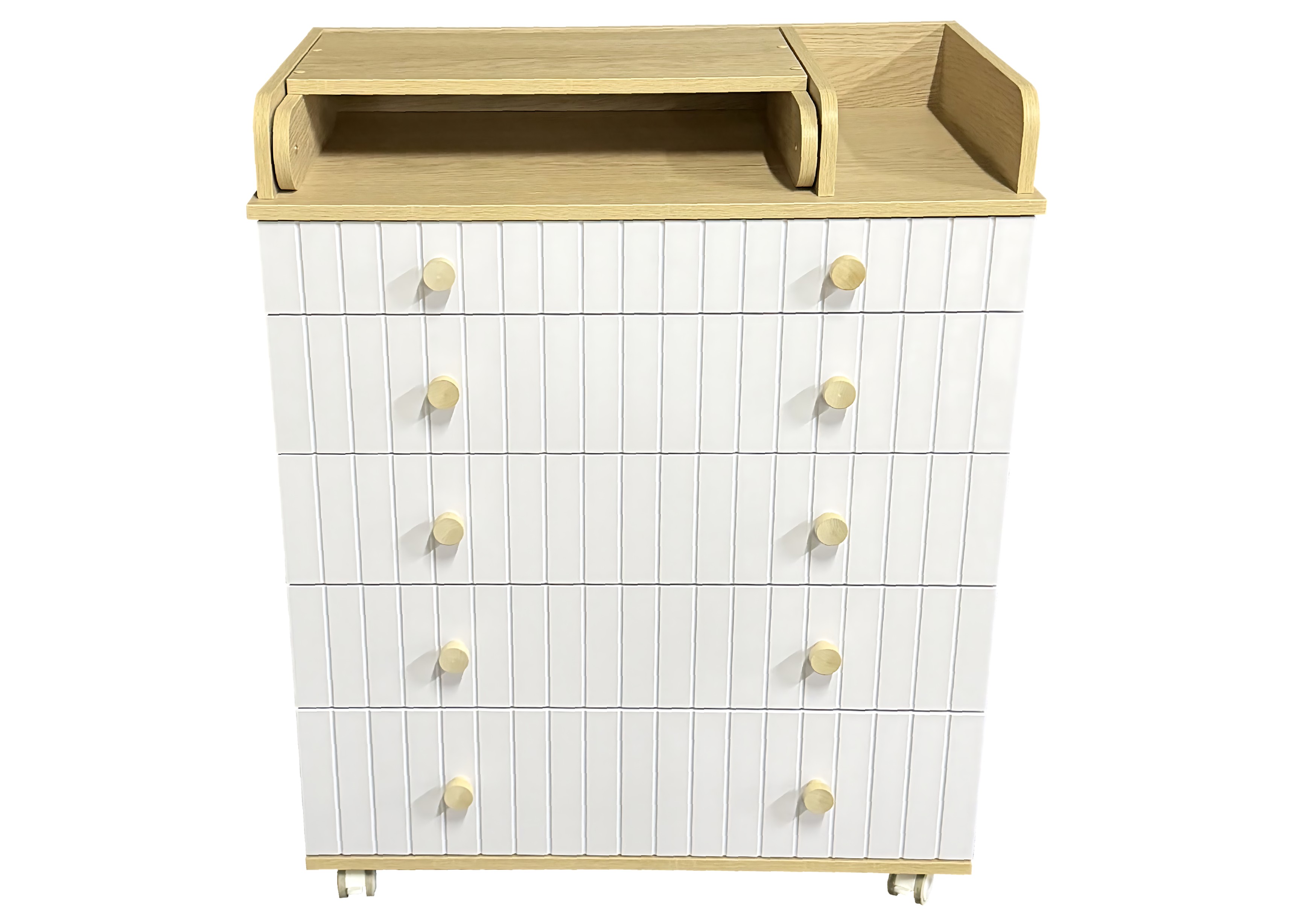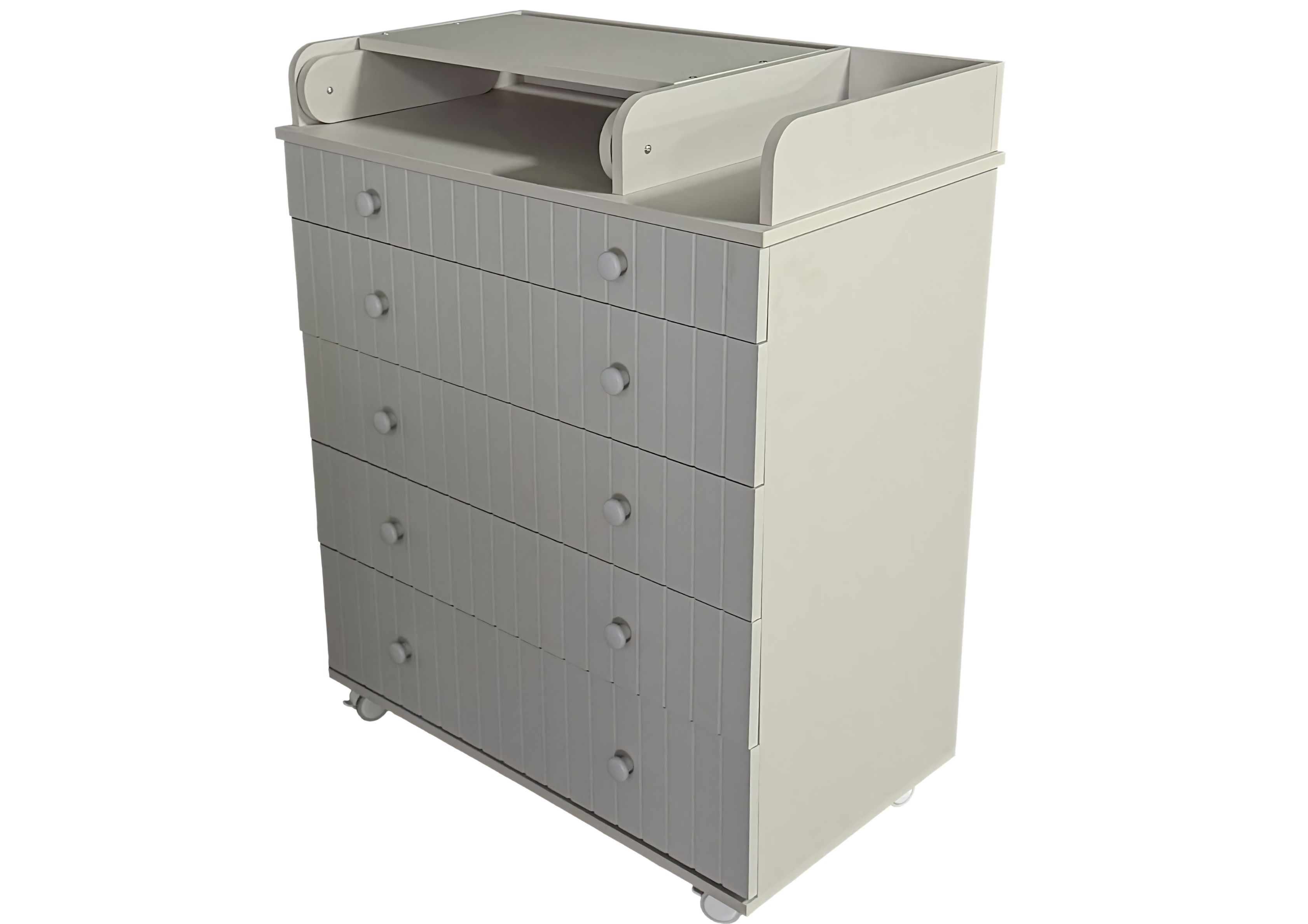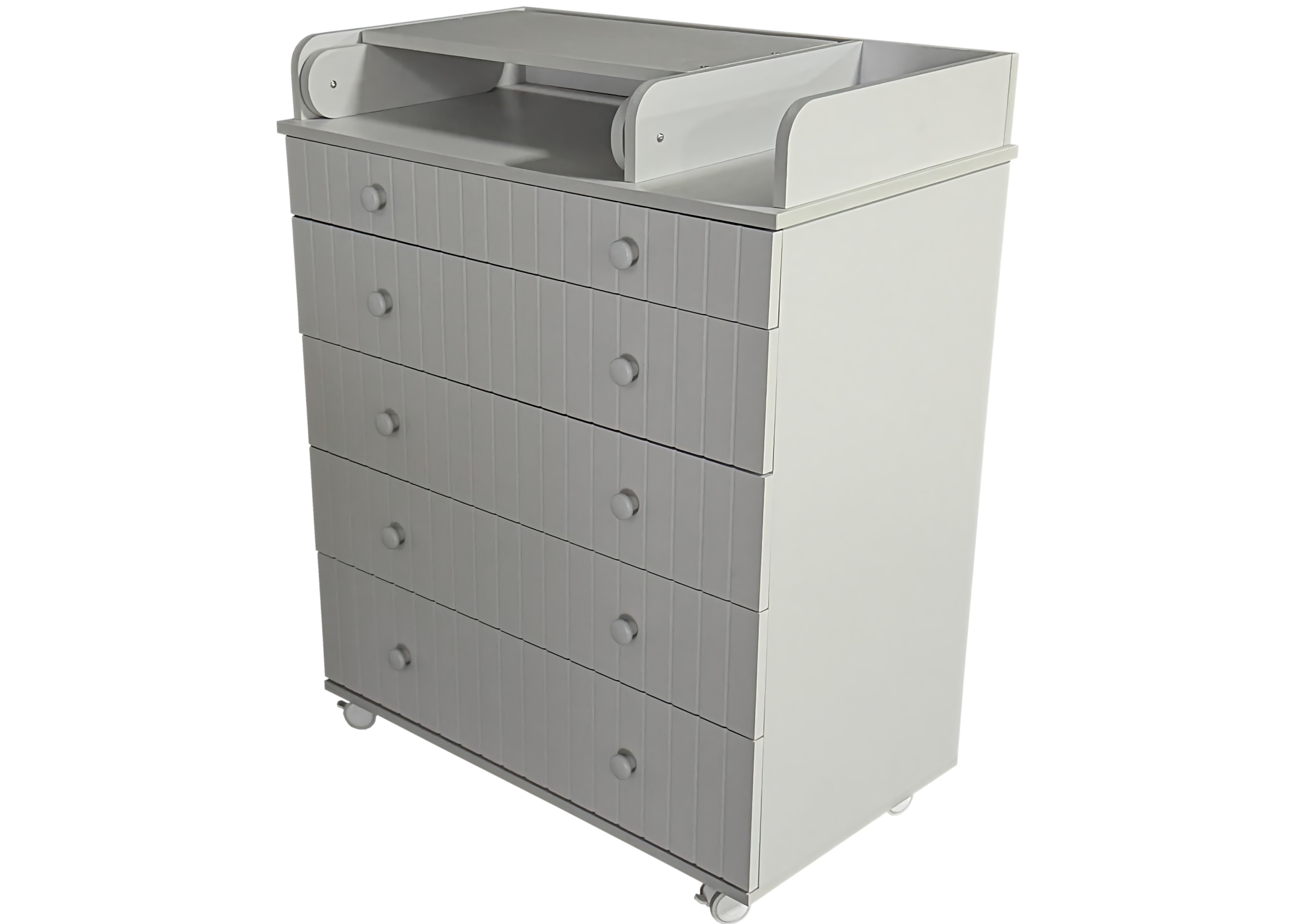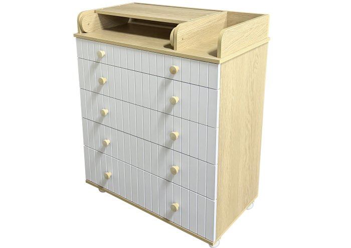 Пеленальный комод LADA с органайзером - практичный и незаменимый предмет мебели в детской комнате. Комод имеет 5 выдвижных ящиков на шариковых направляющих, верхний ящик имеет удобный органайзер для детских принадлежностей. В комплекте есть колеса для удобства перемещения, откидной пеленальный столик для проведения всех необходимых гигиенических процедур с малышом.