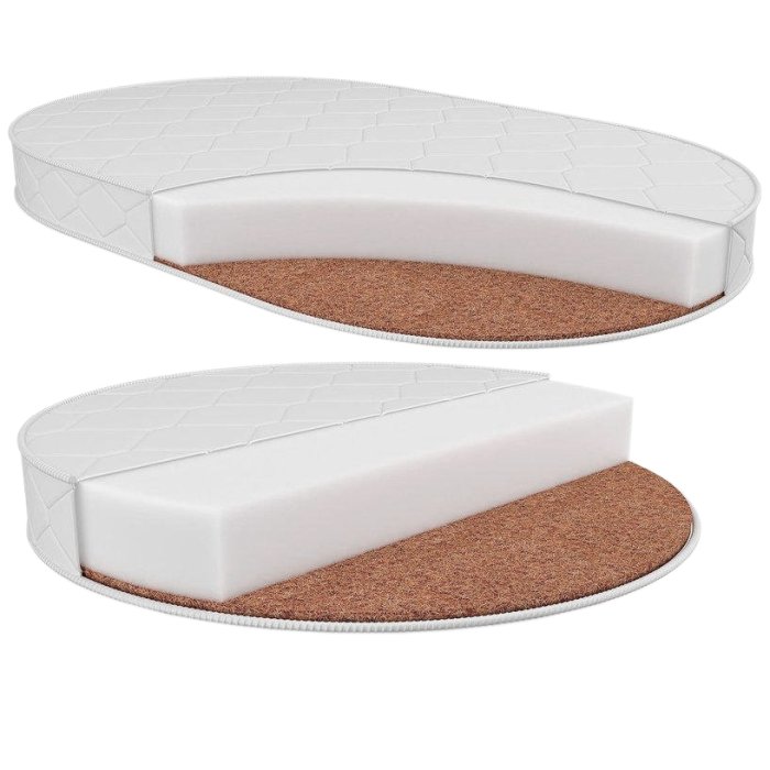 Комплект матрасов круг 750х750 мм + овал 1250х750 мм (для кроватей SOFIA и VALENCIA) состоит из кокосового наполнителя, холлкона и стеганного чехла на молнии из микрофибры.
