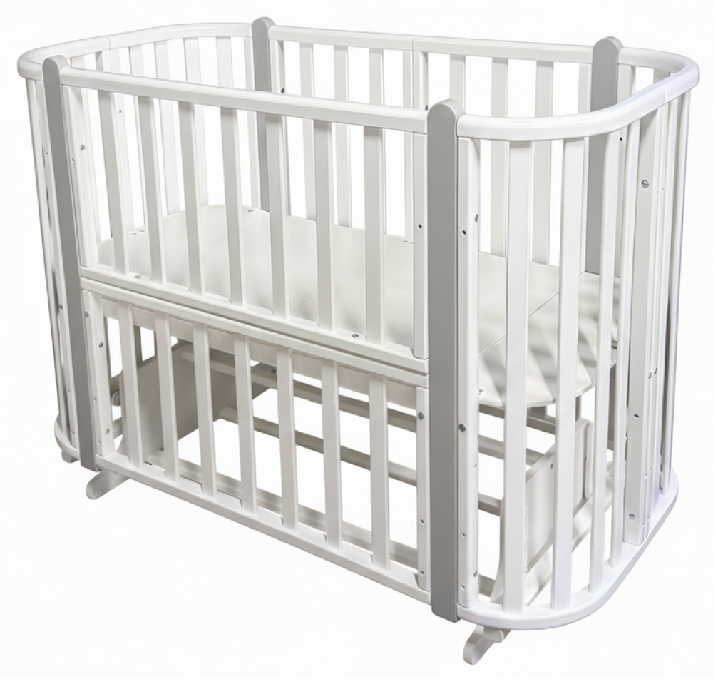 Новая кроватка БЕЛОСНЕЖКА трансформируется сначала в люльку со спальным местом 90х60 см, затем, когда ребенок уже подрастет, кровать можно трансформировать в овальную кроватку со спальным местом 120х60 см. Кровать укомплектована поперечным маятниковым механизмом и колесами. Используются либо колеса, либо маятник. Варианты сборки: люлька, овальная кроватка, манеж на колесах, диванчик. Кровать выполнена из экологически чистых материалов, которые абсолютно безопасны для ребенка.