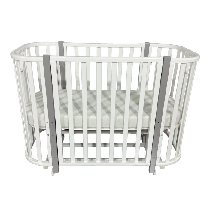 Кроватка ESTELLE 4 - укомплектована поперечным маятниковым механизмом и колесами. Подвижное переднее ограждение с удобным механизмом фиксации в двух положениях по высоте обеспечивает свободный доступ к малышу. Варианты сборки: Овальная кроватка на колесиках, диванчик, манеж. Кровать выполнена из экологически чистых материалов, которые абсолютно безопасны для ребенка