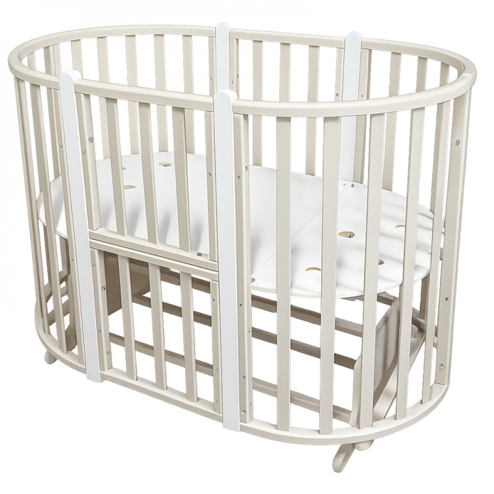 Новая кроватка ФИАЛКА трансформируется сначала в круглую люльку со спальным местом 75х75 см и пеленальный столик. Затем, когда ребенок уже подрастет, кровать можно трансформировать в овальную кроватку со спальным местом 125х75 см. Кровать укомплектована поперечным маятниковым механизмом и колесами. Используются либо колеса, либо маятник. Варианты сборки: круглая кроватка, овальная кроватка, манеж на колесах, диванчик. Кровать выполнена из экологически чистых материалов, которые абсолютно безопасны для ребенка.